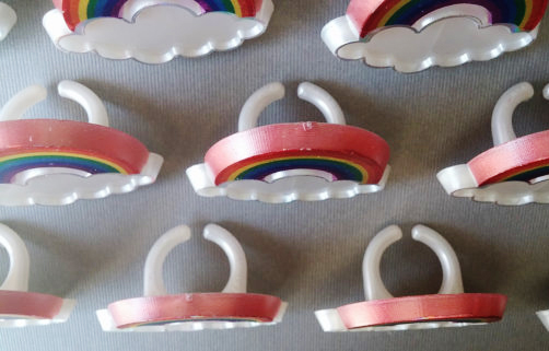 Rainbow with clouds themed rings for cupcake toppers. Also, roll ham or cheese and insert the ring, later kids can wear the ring home as a prize.